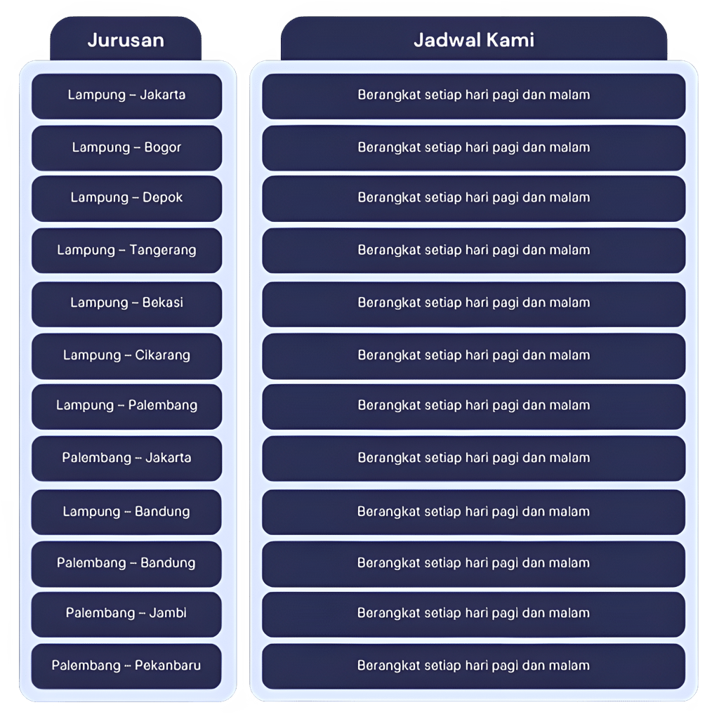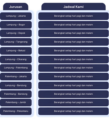 Kami melayani travel reguler dengan rute Lampung – Jakarta (PP), Lampung – Palembang (PP). Dengan driver yang profesional yang siap menjadi partner perjalanan Anda semakin nyaman dan aman sampai tujuan.